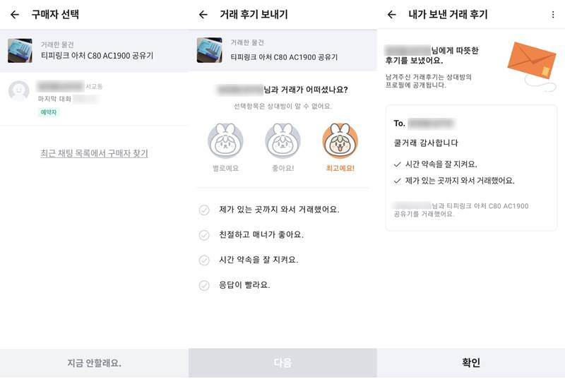 - 거래 후기 남기기: 거래가 완료된 후에는 상대방에 대한 후기를 남깁니다. 당근마켓은 사용자 간의 신뢰를 쌓는 데 후기 시스템이 중요한 역할을 합니다.